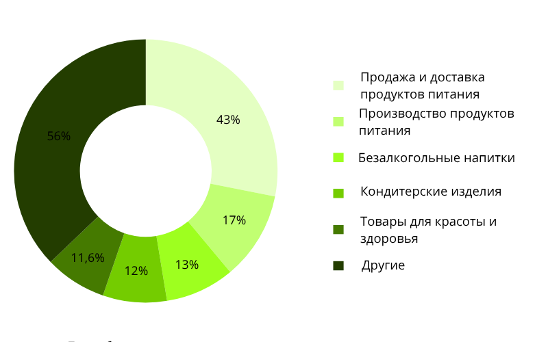 Больше всего промоактивностей в 3 квартале принадлежит категории “Продажа и доставка продуктов питания” — 195 промособытий, что составляет около 40% от общего объема. Следующая по количеству промо категория — “Производство продуктов питания” — 89 промоактивностей, или около 18% от общего объема. Третьей идёт категория “Безалкогольные напитки” с 74 промо (примерно 15% от общего объема).